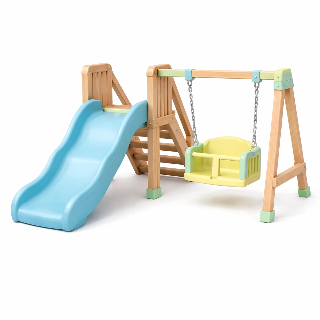 Material: Kiefernholzrahmen, Polyethylenrutsche und -schaukel