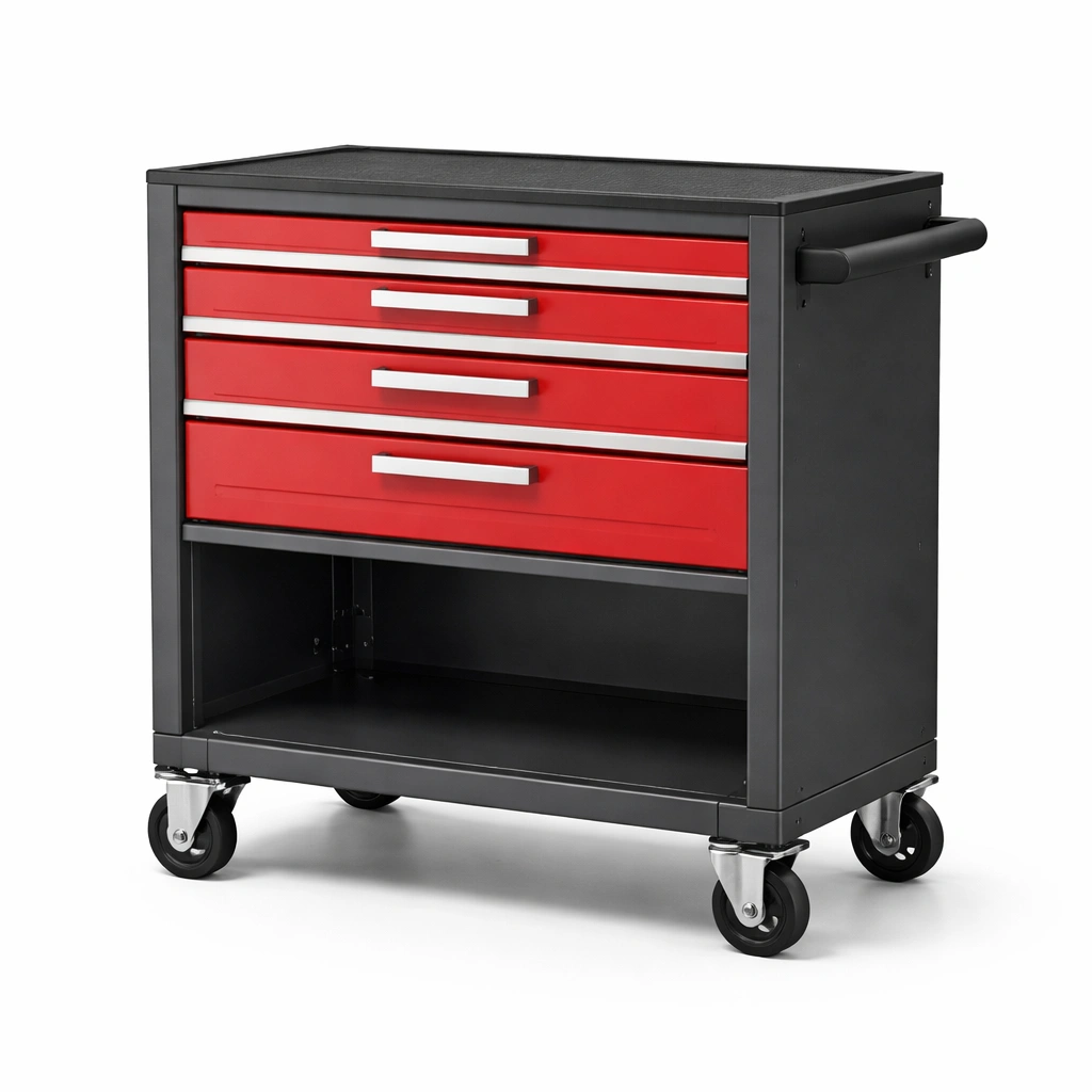 Der Werkzeugwagen besteht aus pulverbeschichtetem Stahl und ist in Rot und Schwarz gehalten. Er misst 75 cm in der Länge, 47 cm in der Breite und 87 cm in der Höhe.